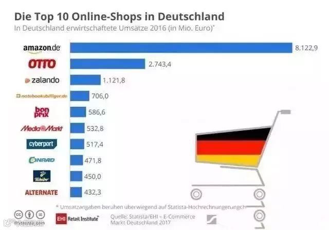 根据2017年德国电子商务基金会的报告显示,德国在线消费者人数高达5200万,网购者在电商网站的平均花费为1515欧元,其中,40%的网上购物者都会选择跨境购物,并且他们会偏向商品价格相对便宜的中国。