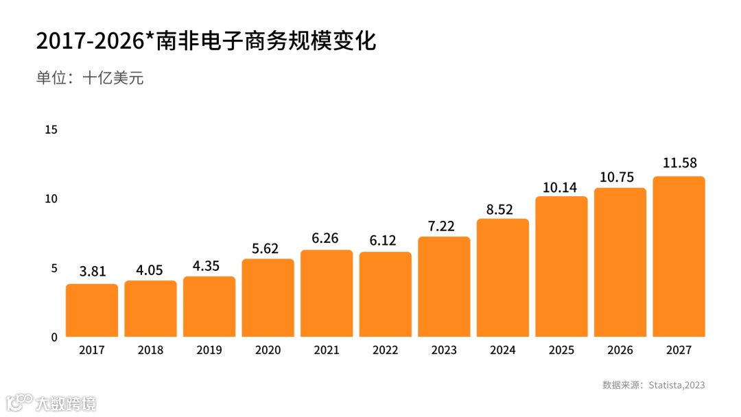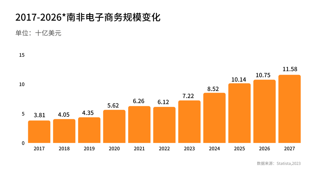 Statista此前公布的一项数据显示,南非是世界排名四十二,非洲排名第二的电商市场,预计到2023年收入将达到72.2亿美元,增长17.9%,略高于2023年全球增长率(17.0%)。