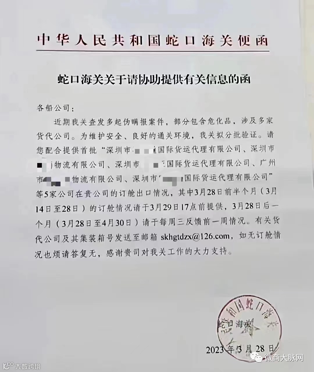 3月28日,深圳蛇口海关向各大集装箱班轮公司发出紧急协助函,5家货代企业出现在海关通知中!
