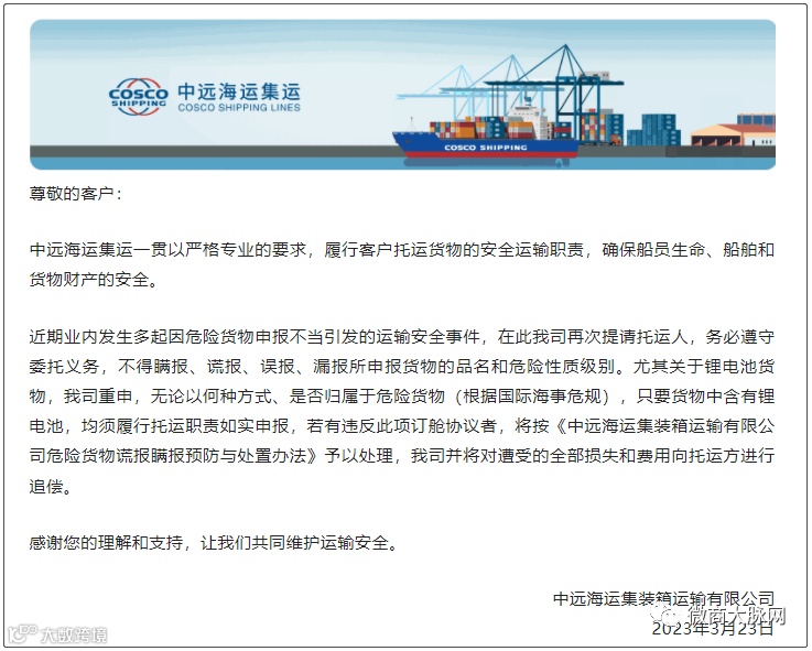 3月23日,中远海运集运发布《关于重申正确申报货物信息的告客户书》。