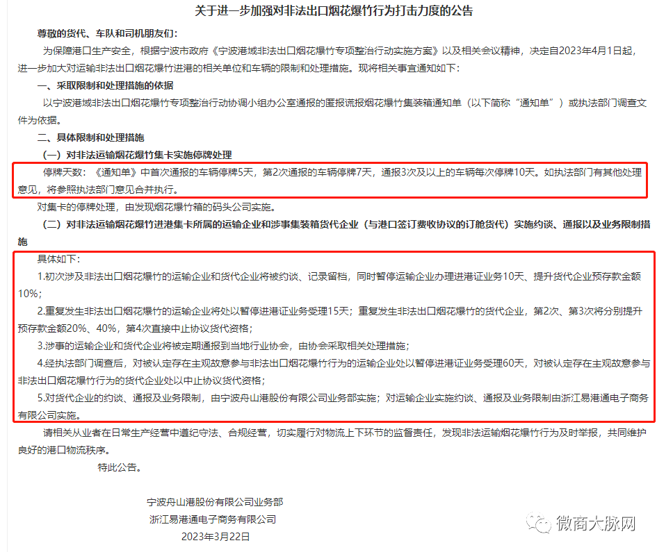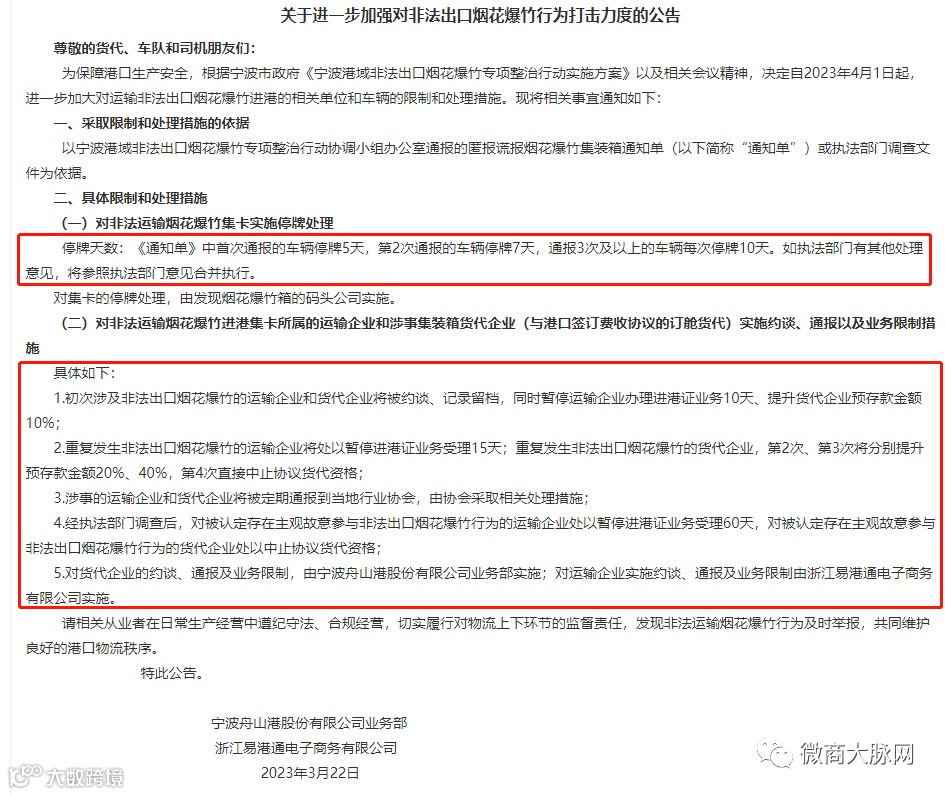 3月22日,宁波舟山港和浙江易港通联合发布了《关于进一步加强对非法出口烟花爆竹行为打击力度的公告》。