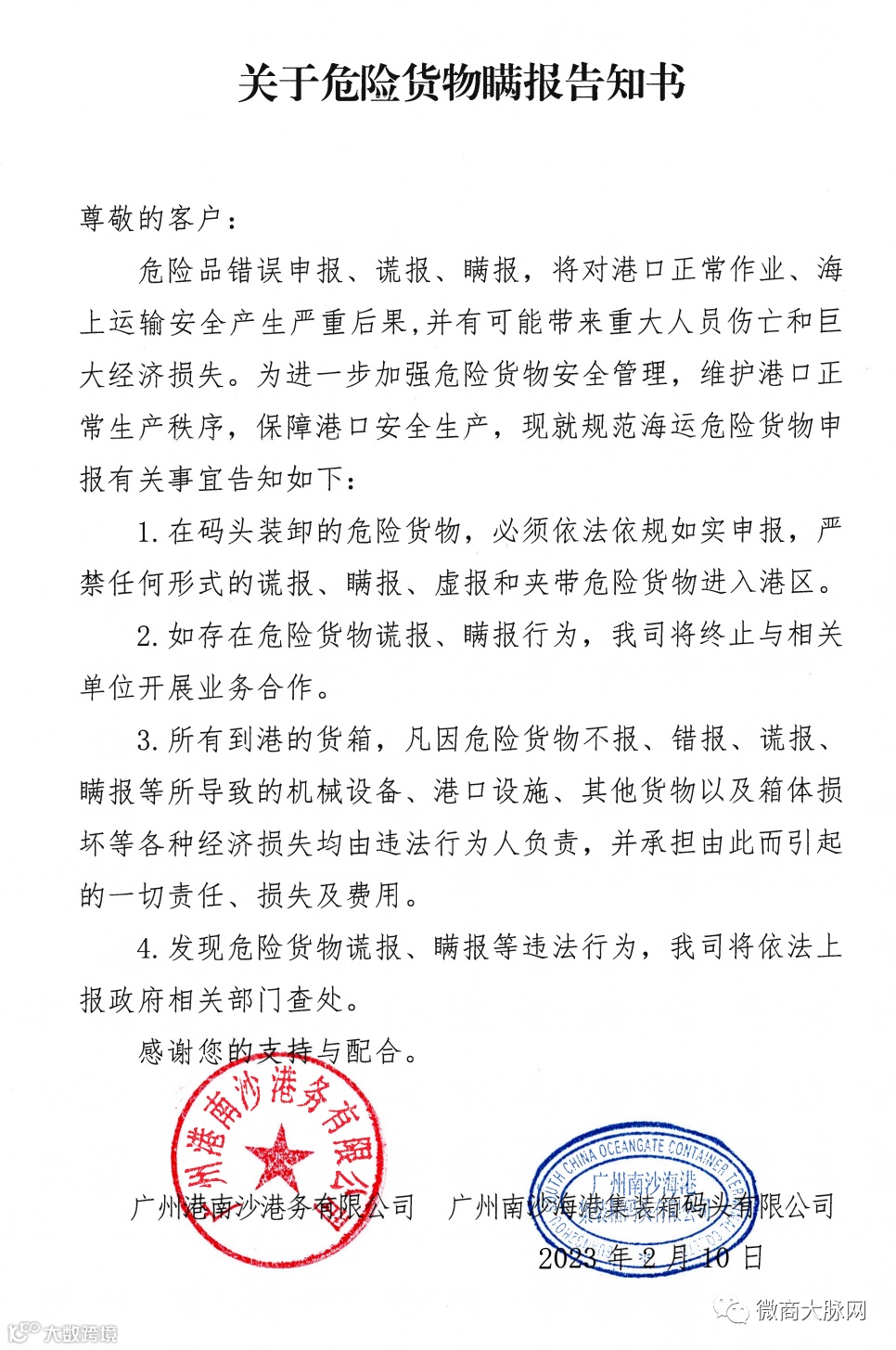为进一步加强危险货物安全管理,维护港口正常生产秩序,保障港口安全生产。一经发现危险货物谎报、瞒报行为,将终止相关单位业务合作;承担由此而引起的一切责任、损失及费用;同时将依法上报政府相关部门查处。
