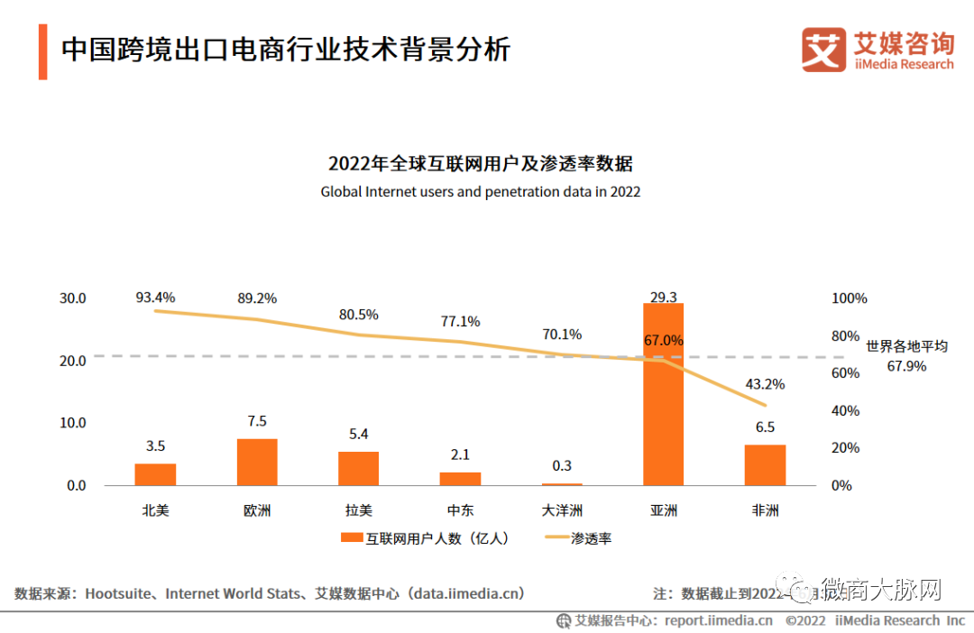 数据显示2022年全球互联网人数为54.7亿人,同比上涨了17.4%;渗透率为69%,相比2021年增加9.5%。