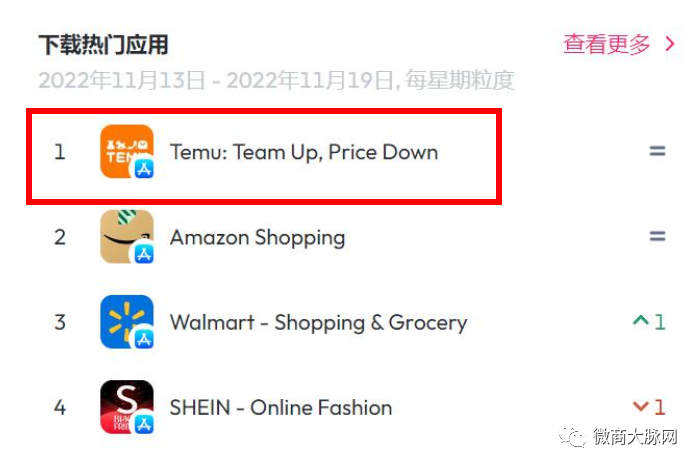 Temu也用成果证明,这种打法打对了。不到50天的时间,Temu成功超越亚马逊、SHEIN、沃尔玛等应用,登上美国App Store购物应用榜第一的位置,