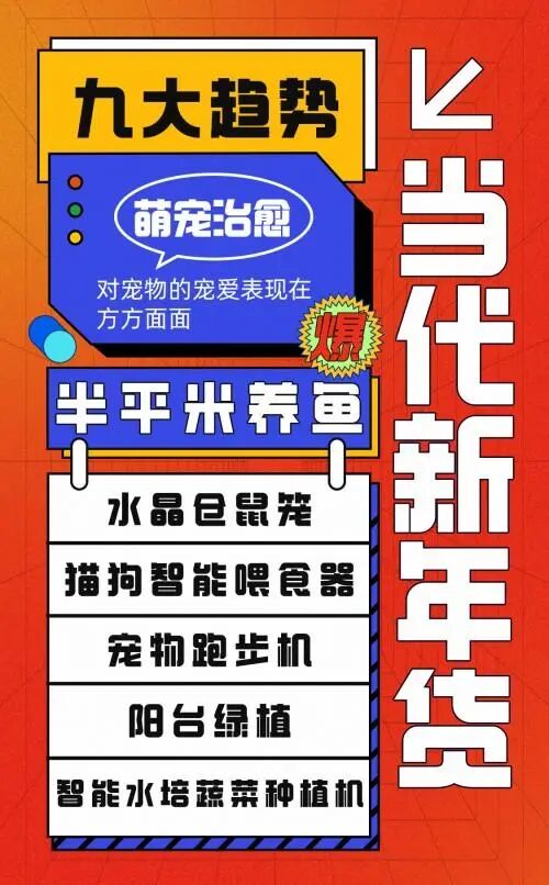 日前,天猫发布了当代新年货的九大趋势,包括关爱健康、智能陪伴、萌宠治愈、沉浸式宅家、云端生活、近郊社交、复古风潮和文化自信等,这也是消费者对新年新生活的新定义和向往追求。
