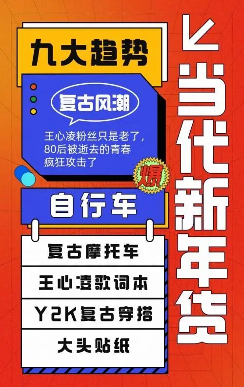 2022年,80后、90后的又青春回来了!王心凌的一首《爱你》唤醒了无数80后的记忆一时间,王心凌歌词本成为淘宝流量关键词之一,Y2K复古穿搭、大头贴纸等复古风潮成了潮流趋势。