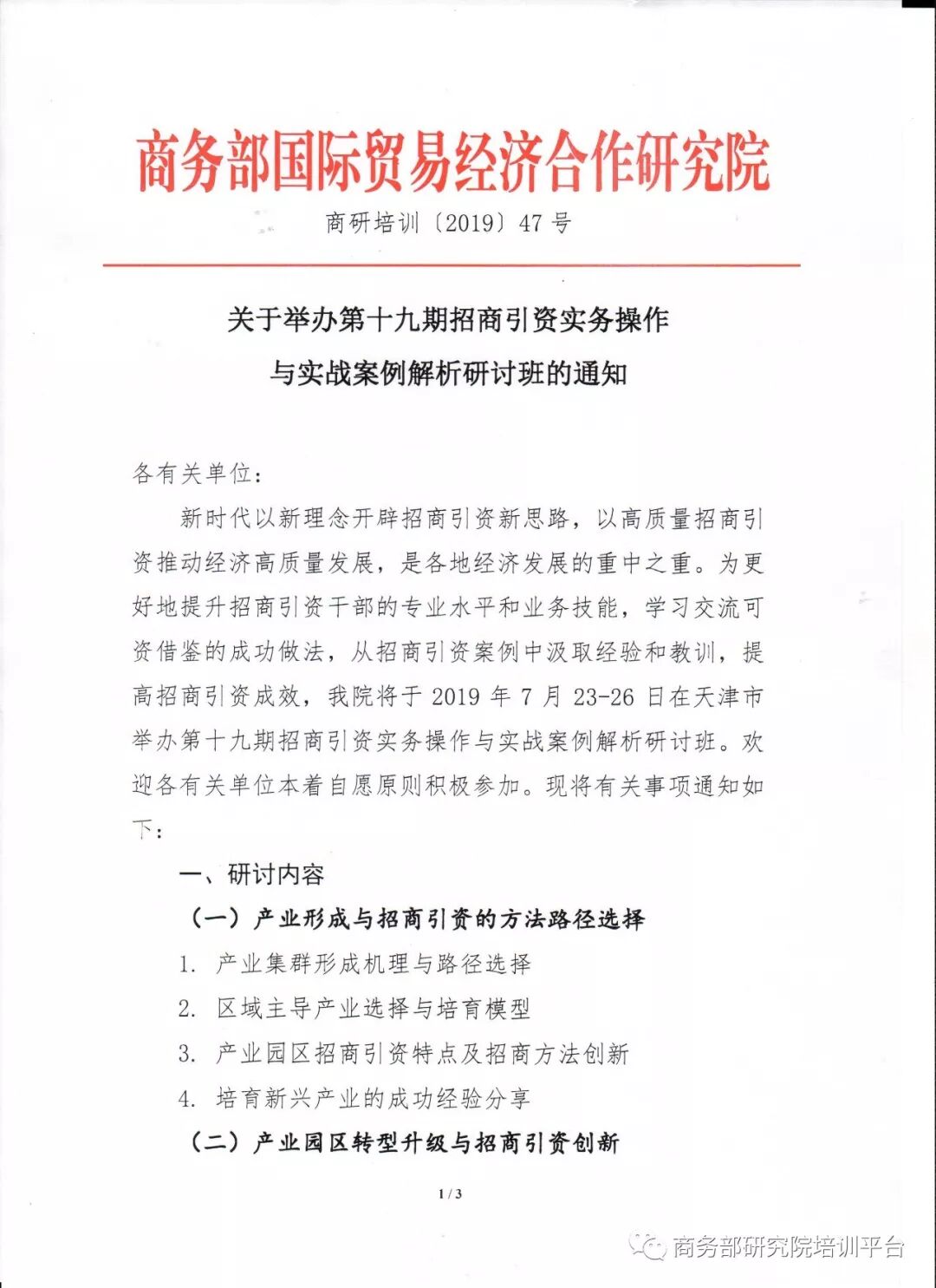 导读:关于举办第十九期招商引资实务操作与实战案例解析研讨班的通知
