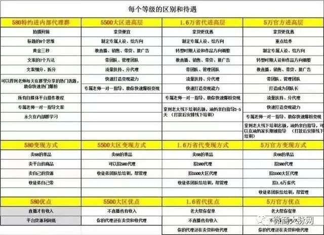 她给我展示了一把通往高层的“钥匙”,是一张图片,上面有各个级别代理的区别和待遇。分别是580元特约,5500大区,1.6万元省代和5万元官方。张雯透露,她的老大是40万董事,涵妈则是200万联合创始人。