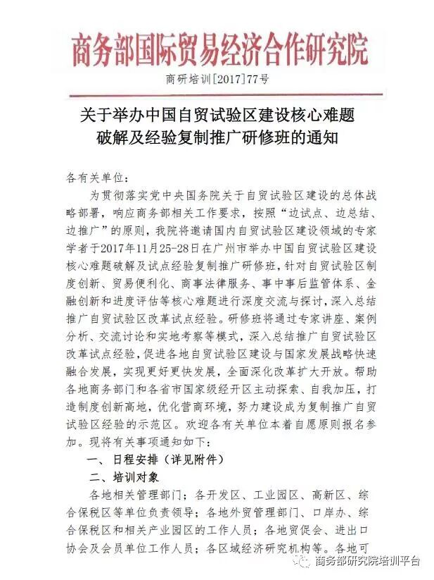 导读:关于举办中国自贸试验区建设核心难题破解及经验复制推广研修班的通知