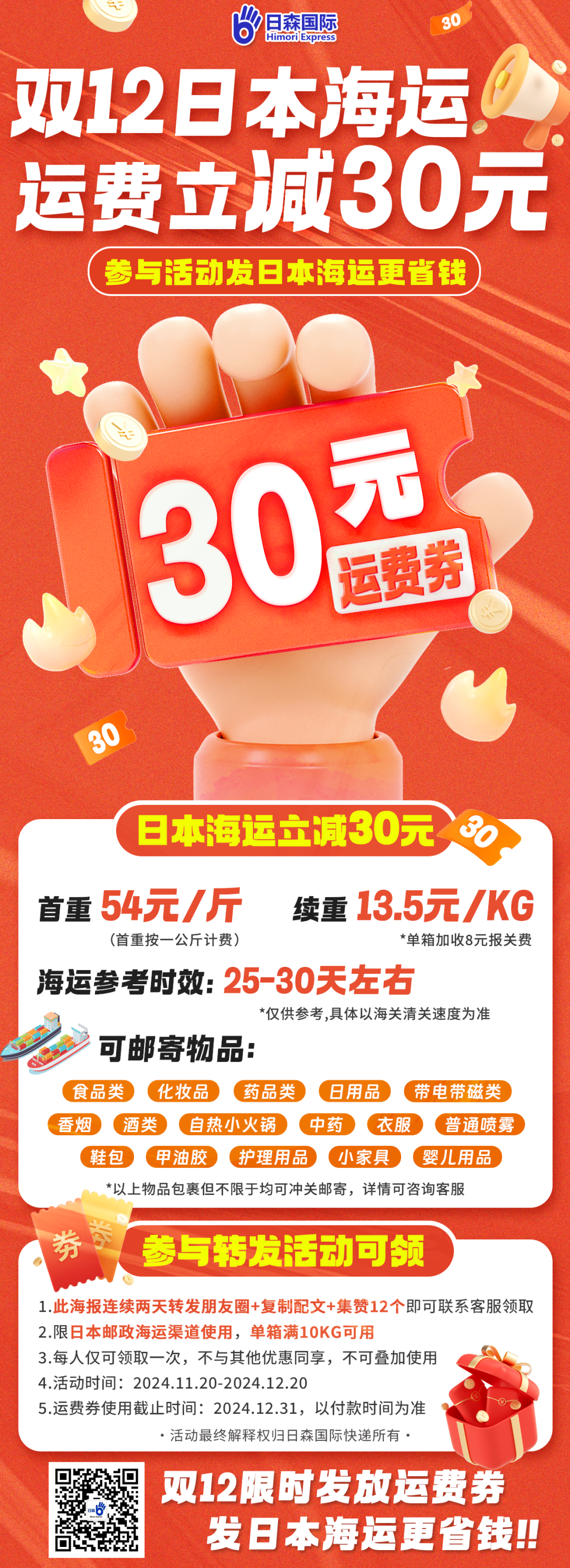 日森国际双十二限时发放30元大额运费券!发日本海运更省钱~单箱30KG仅需477元!