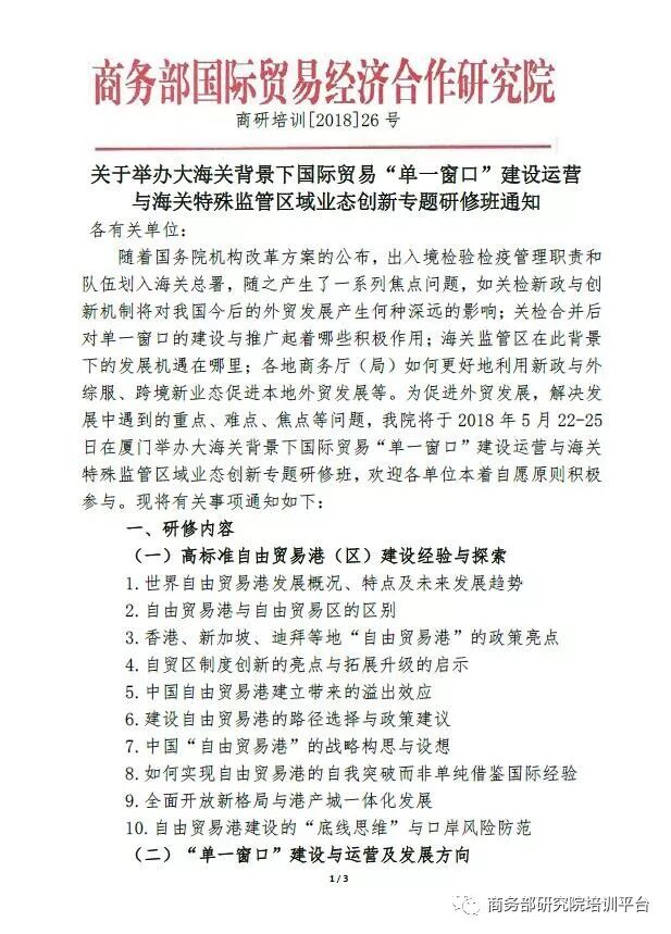 导读:关于举办大海关背景下国际贸易“单一窗口”建设运营与海关特殊监管区域业态创新专题研修班通知