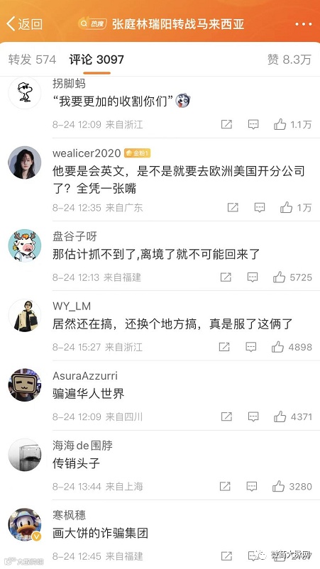 对于此次林瑞阳转战马来西亚一事,网友们表示“这是要沿着一带一路骗过去吗”,评论一片骂声。