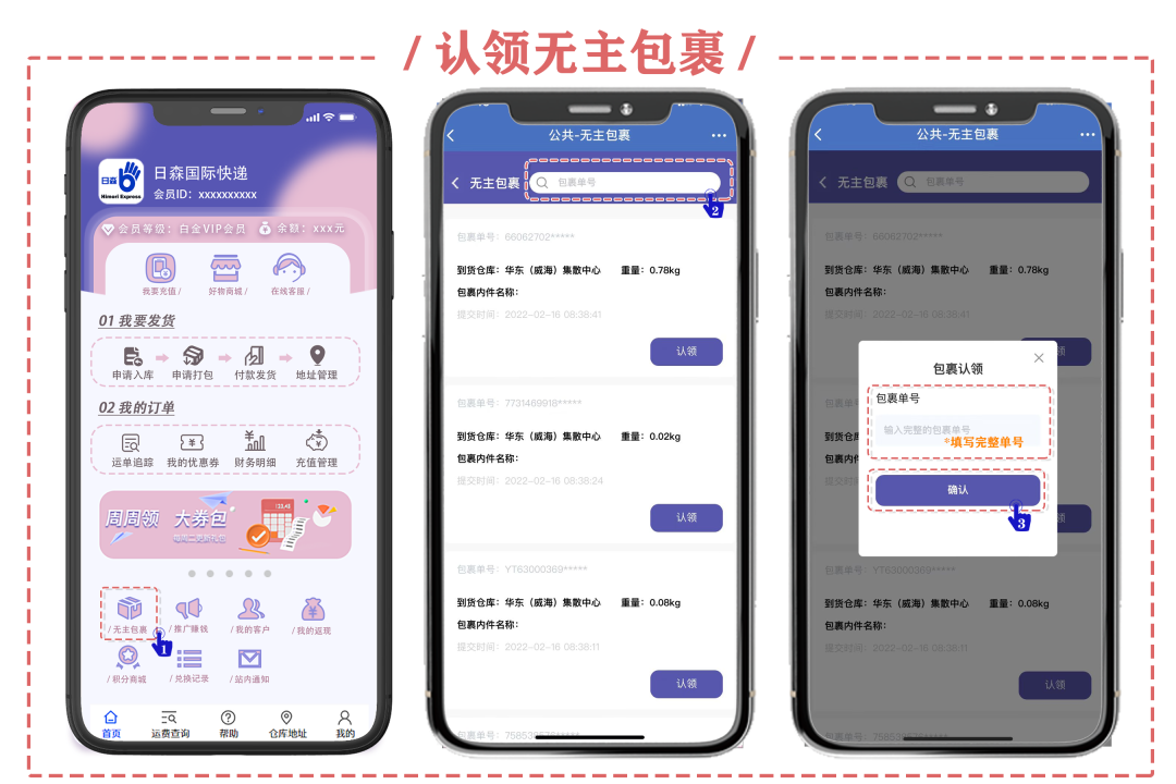 显示签收但未收到入库信息的包裹,很有可能因为地址填写错误或隐藏收件人信息等问题所致,可在【无主包裹】内将完整单号输入认领包裹。
