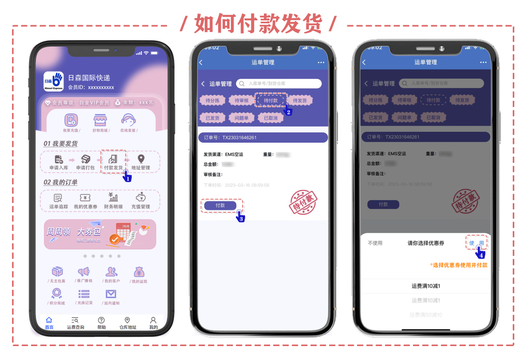 付款前:务必点开详情,查看地址信息,渠道,重量,金额以及是否有打包不能发取出的物品。确认无误后再进行充值付款,付款后无法更改。