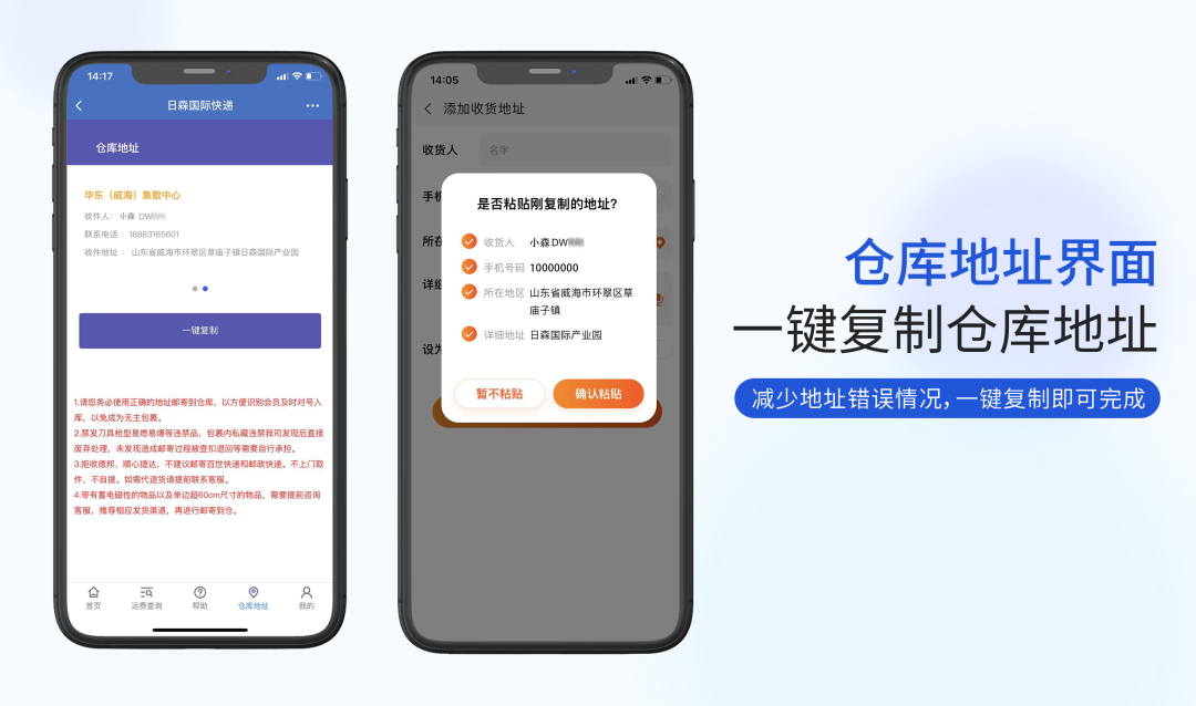 更改原先单条复制的复杂模式,升级成【一键复制】按钮!可一秒复制并添加至各个平台收货地址内,减少了地址填写出错情况。