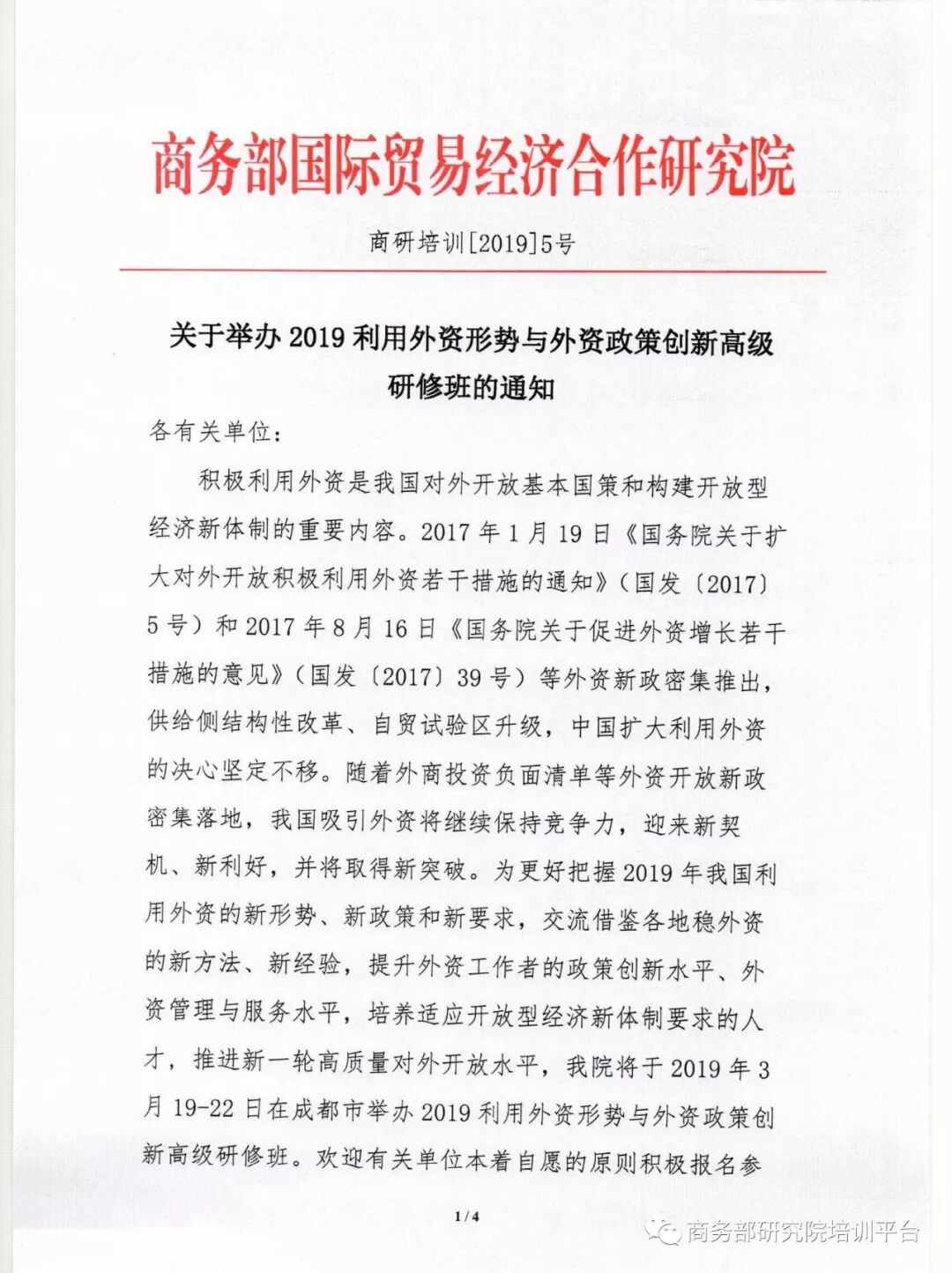 导读:关于举办2019利用外资形势与外资政策创新高级研修班的通知