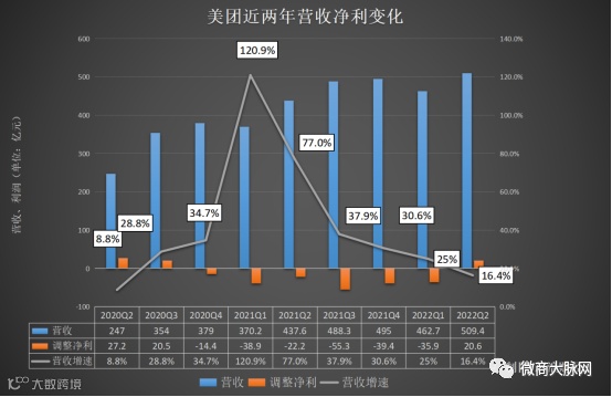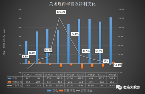 8月26日,美团发布2022年第二季度及半年度业绩。今年第二季度,美团实现营收509亿元,同比增长16.4%;净亏损11.2亿元,同比收窄67%;调整后净利润20.6亿元,实现扭亏为盈。