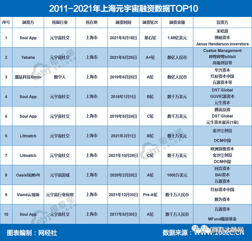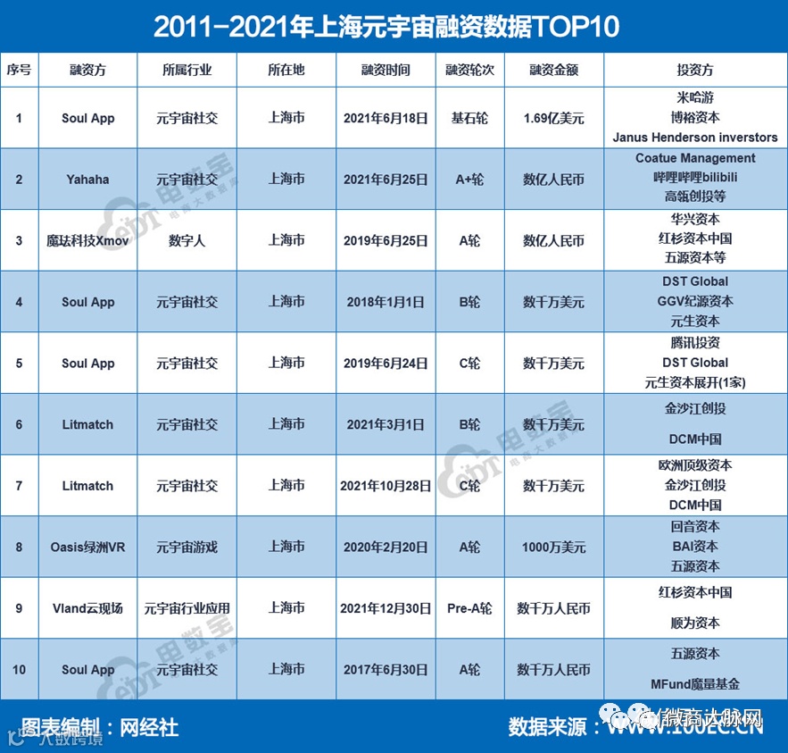 在融资额上,2011年至2021年上海元宇宙融资额排名前十的分别为:Soul App1.69亿美元,Yahaha数亿人民币,魔珐科技Xmov数亿人民币,Soul App数千万美元,Soul App数千万美元,Litmatch数千万美元,Litmatch数千万美元,Oasis绿洲VR1000万美元,Vland云现场数千万人民币,Soul App数千万人民币。
