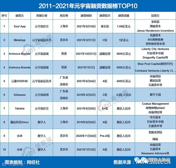 2011年-2021年元宇宙81起融资事件中,融资额排名前十的有Soul App(1.69亿美元),MetaApp(1亿美元),Animoca Brands(5600万美元),Animoca Brands(5000万美元),元象XVERSE(4000万美元),3Glasses(2.4亿人民币),Yahaha(数亿人民币),魔珐科技Xmov(数亿人民币),小冰(数亿人民币),小冰(数亿人民币)。