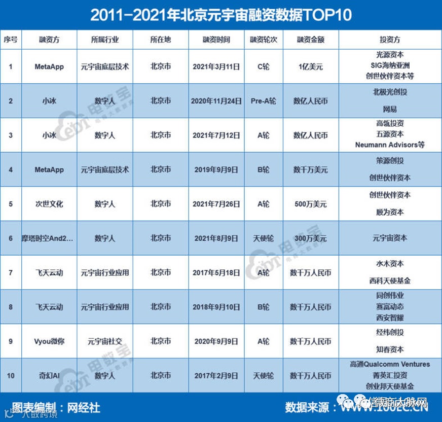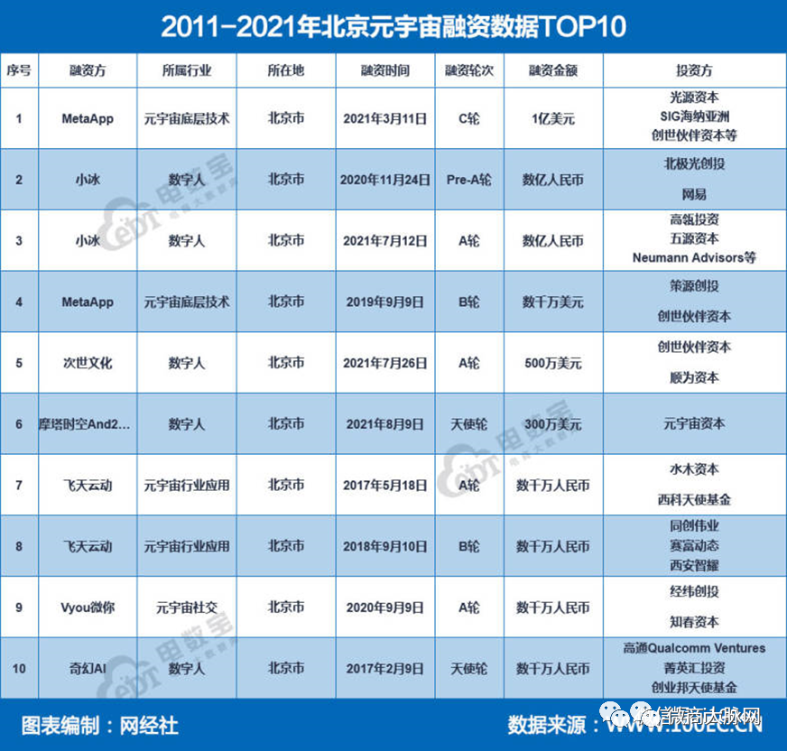 排名第二的北京融资数量26起,融资金额超14.56亿元。2011年至2021年,北京元宇宙融资额排名分别为:MetaApp1亿美元,小冰数亿人民币,小冰数亿人民币,MetaApp数千万美元,次世文化500万美元,摩塔时空And2girls300万美元,飞天云动数千万人民币,飞天云动数千万人民币,Vyou微你数千万人民币,奇幻AI数千万人民币。(如果您是业内人士,欢迎咨询加微信:clt7513)