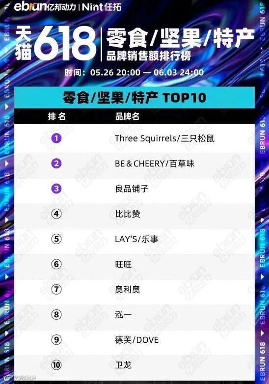 食品相关类目榜单也发生了较大的变化,零售坚果类目的TOP10几乎全员更新。销售排名前10位的分别是三只松鼠、百草味、良品铺子、比比赞、乐事、旺旺、奥利奥、泓一、德芙、卫龙。预售榜单中的藤桥、初旭、王小卤、Easy Fun、每鲜说、榴芒一刻等暂时消失。