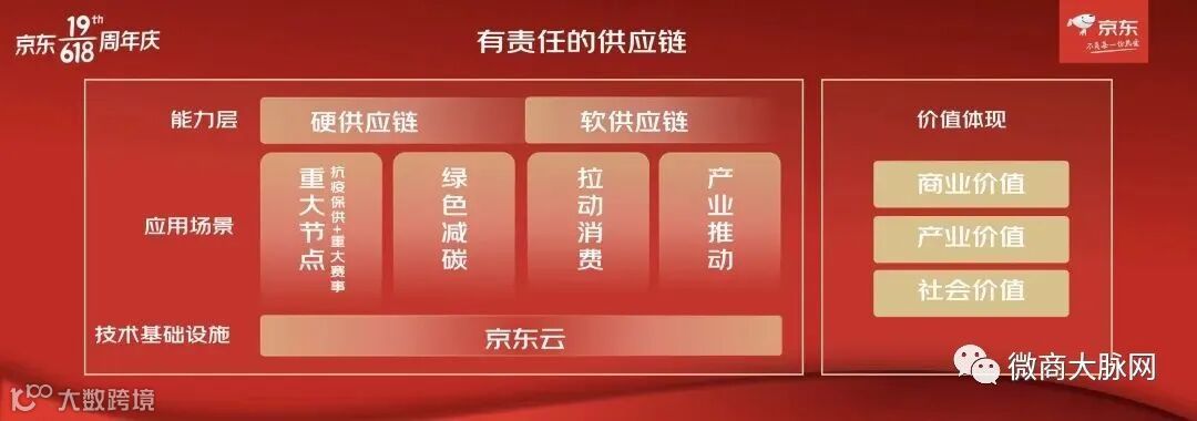 此次京东618提出有责任的供应链,通过“两横四纵”,以及以京东云为代表的技术基础设施,让京东数智化社会供应链发挥更大价值。