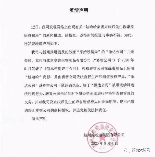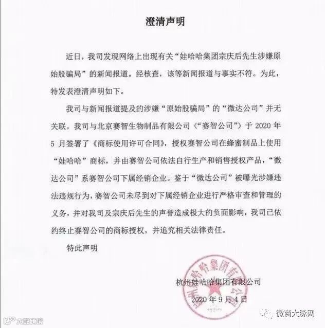 娃哈哈尽管随后发布官方声明辟谣称,微达公司系赛智公司下属经销企业,与娃哈哈集团并无关联,赛智公司只是娃哈哈的商标授予方。但也给娃哈哈创始人宗庆后造成不小的名誉损失。