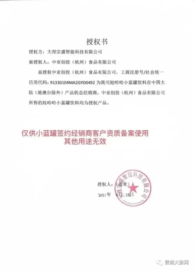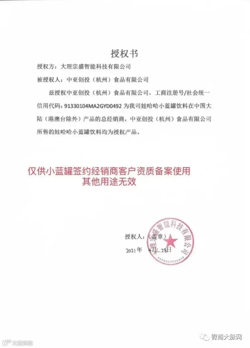 3个月后,中亚创投才成为娃哈哈小蓝罐的总经销商。记者获得文件显示,2021年4月1日,娃哈哈集团将娃哈哈品牌授予大理宗盛智能科技有限公司(下称“大理宗盛”),授权有效期为2021年4月1日——2023年4月1日。随后,大理宗盛授权中亚创投为娃哈哈小蓝罐饮料在中国大陆的总经销商。