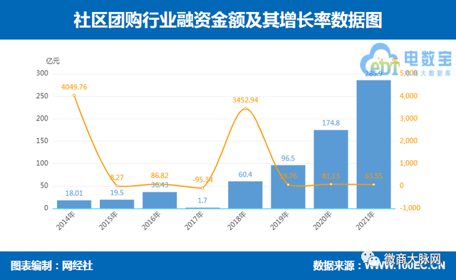 报告显示,2021年我国社区团购融资数为10起,总额为285.9亿元,同比增长63.55%。涉及的平台包括:谊品生鲜、兴盛优选、海豚购、好邻好物、十荟团、菜娘子、光一供应链、康品汇。社区团购融资爆发期已过,2018年融资金额增速超3000%,此后三年日趋平稳。