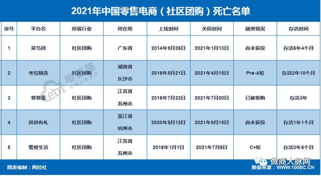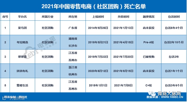据网经社“电数宝”电商大数据库显示,2021年社区团购“死亡”数为5家,分别为菜鸟团、考拉精选、邻邻壹、拼拼有礼、蜜橙生活。(注:本数据库定义的“死亡”包括公司破产、倒闭、重大重组、创始人跑路、平台关停或停更等)