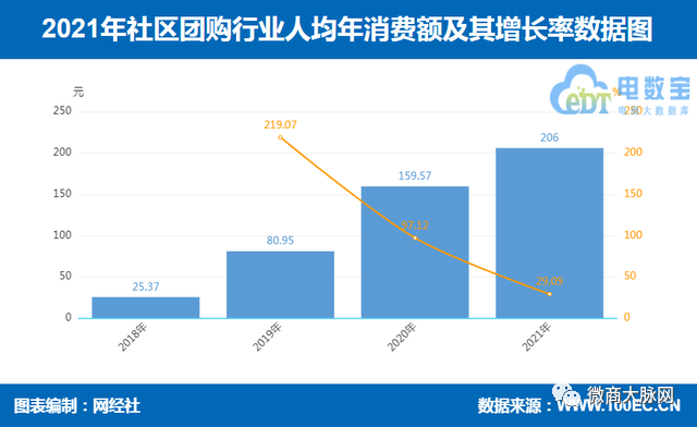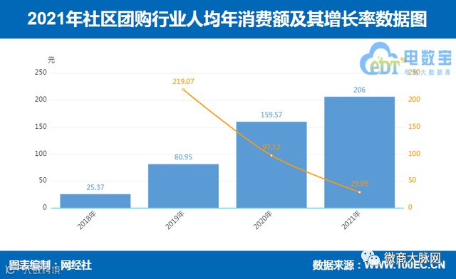 2021年国内社区团购人均年消费额为206元,同比增长29.09%。