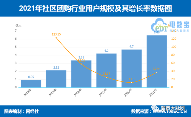 据网经社旗下电商大数据库“电数宝”(DATA.100EC.CN)监测数据显示,2021年社区团购用户规模达到6.46亿人,同比增长37.44%。