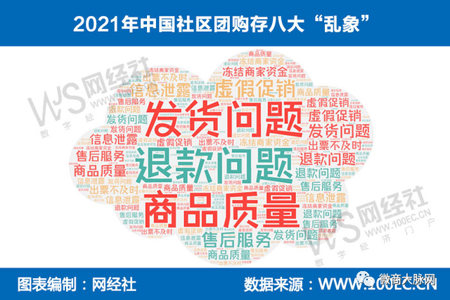 据网经社“电诉宝”(315.100EC.CN)数据表明,2021年社区团购被投诉问题主要聚焦在:退款问题、发货问题、商品质量、虚假促销、售后服务、信息泄露、冻结商家资金、出票不及时等问题。涉及投诉较多的社区团购平台有:兴盛优选、十荟团、每日一淘等。