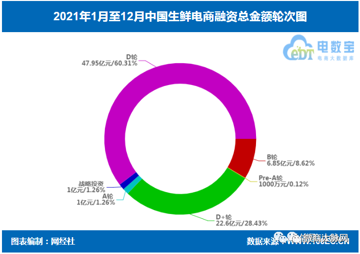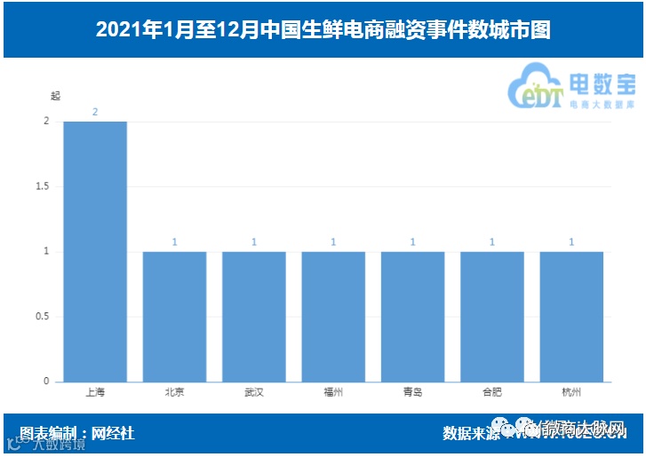 1月6日,我国“一带一路”TOP10影响力社会智库网经社电子商务研究中心(WWW.100EC.CN)发布《2021年中国生鲜电商融资数据榜》。据网经社旗下电商大数据库“电数宝”(DATA.100EC.CN)监测数据显示,2021年中国生鲜电商领域共有7家平台获得融资,分别为T11、森果云、朴朴超市、叮咚买菜、飞熊领鲜、兔子鲜生、菜划算,融资总额约79.5亿元人民币。