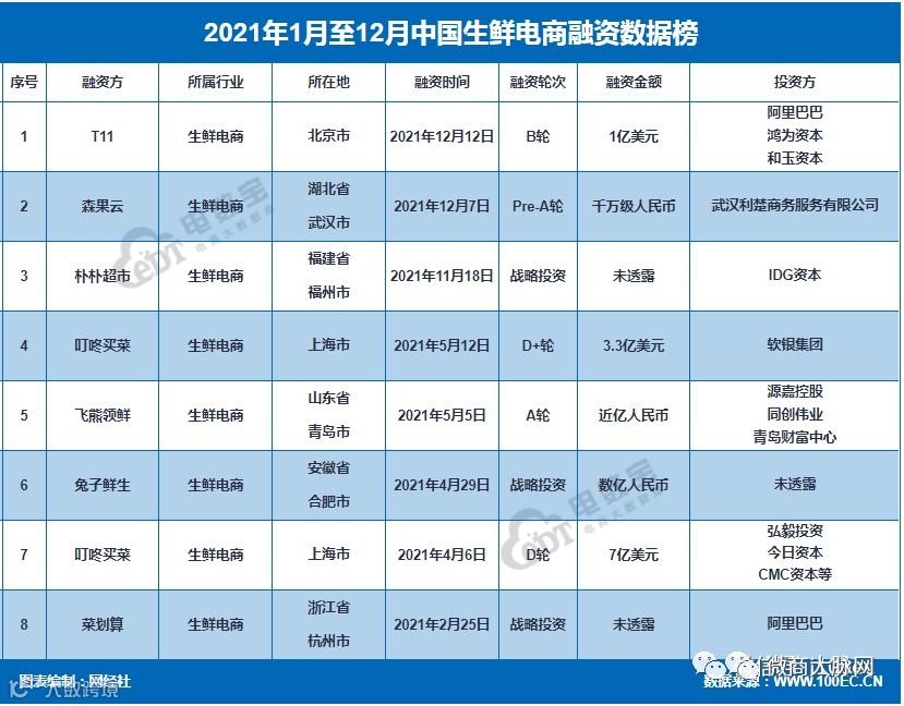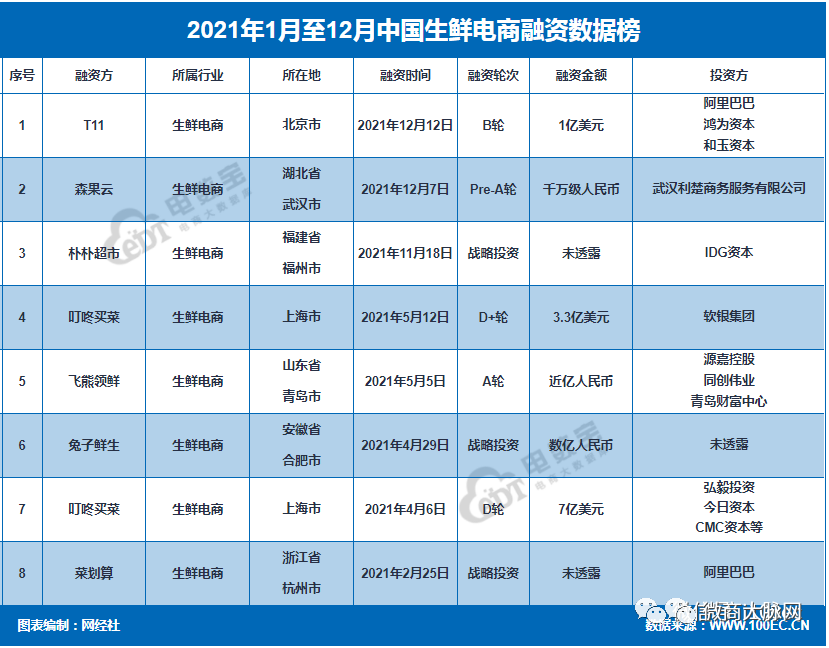 以下国内专业电商投融资服务平台网经社“电融宝”(FA.100EC.CN)为您带来的2021年生鲜电商详细融资事件: