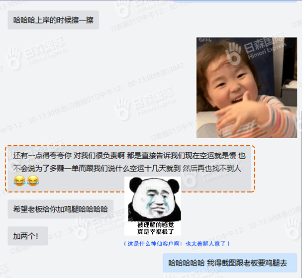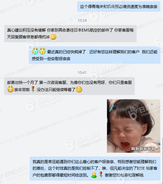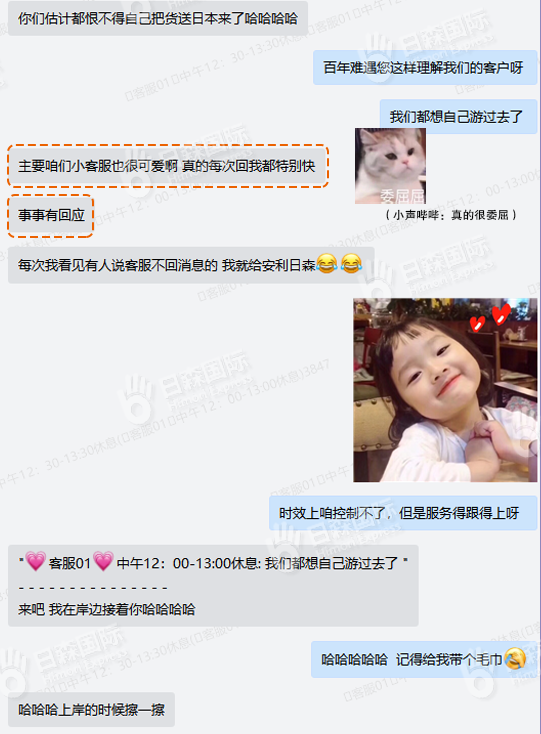 在这几个月中,客服小姐姐也是承受了巨大的时效压力,日森客服非常理解客户因时效问题包裹没收到的焦急心情,日森也很感激在此次特殊情况下还理解我们并且安慰客服的暖心举动。