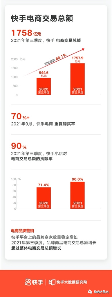 财报显示,2021年第三季度,快手平台上的品牌商家数量进一步增长,品牌商品交易总额增长超过整体电商交易总额的增长,帮助电商渗透率取得同比增长。