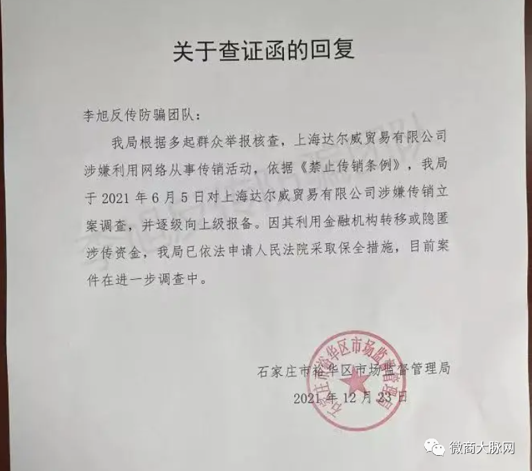 随后,该团队收到石家庄市裕华区市场监督管理局发来的查证回复函,回复函表示,根据多起群众举报核查,达尔威涉嫌利用网络从事传销活动。