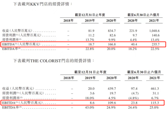 值得一提的是,KK集团旗下子品牌KKV、THE COLORIST调色师自2019年内部孵化成功以来,经营利润和EBITDA始终为正,说明门店运营良好,持续盈利能力出色;其中KKV更是表现亮眼,2021年上半年,KKV实现了经营利润1.4亿元,EBITDA达2.357亿元,EBITDA率较上年同期的18.2%上升到22.5%。