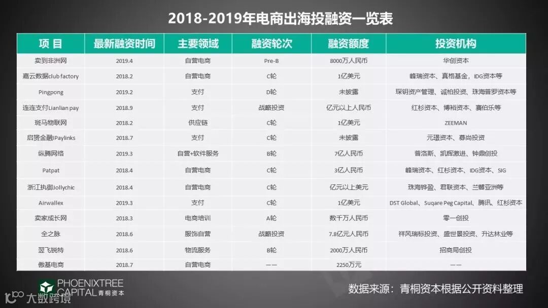 在电商出海领域,资本市场也表现出强烈的信心和兴趣。据统计,从2018年1月至2019年4月,共有14起电商出海相关的融资事件,其中占主流的是B2C电商项目,共有7个,融资轮次主要集中在C轮。此外,围绕电商出海的支付、供应链、物流、培训、软件服务项目也开始获得资本关注。
