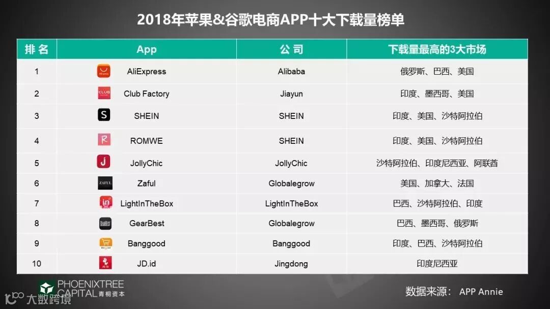 当前电商出海呈现出全新的格局,越来越多的B2C自营电商企业也加入到出海的阵列,并逐步具备竞争优势。在APP Annie发布的2018年10大中国出海电商APP下载排行榜中,Club Factory 、SHEIN、Romwe、JollyChic等4家B2C电商也开始崭露头角,这些平台的主营类目主要集中在服饰鞋帽、家居用品。