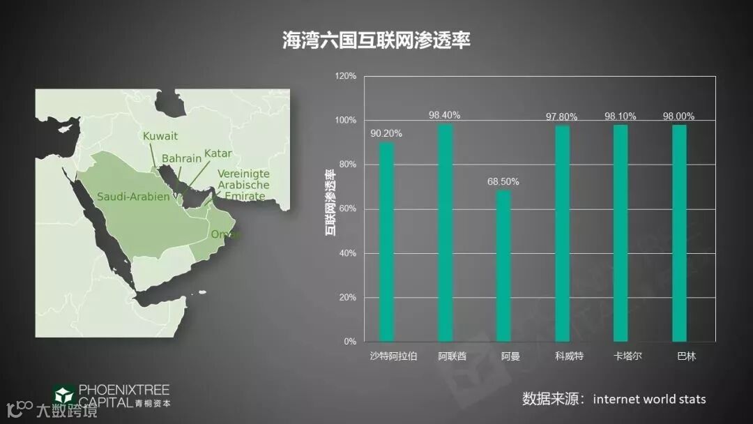 中东地区的海湾国家以“富有”著称,经济发展水平和互联网渗透率均居世界前列。以阿联酋、沙特、卡塔尔、科威特、阿曼和巴林为代表的海湾国是中东最富有的新兴市场,也是中东出海最主要的区域。海湾六国城市化率超过90%,人均GDP高达2万美元,是中国的2倍之多。除阿曼外,其他5国互联网渗透率均在90%以上,其中阿联酋达到98.4%,位居世界前五。