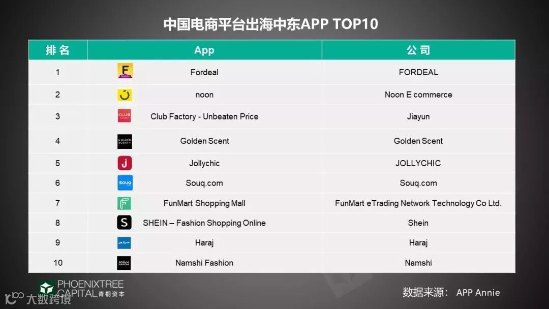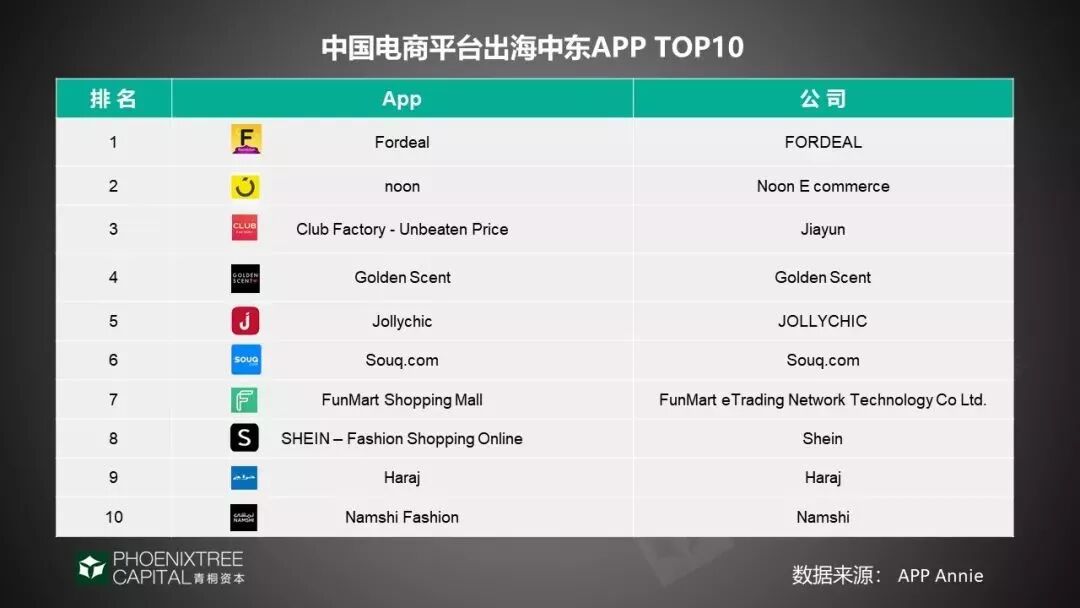 活跃在中东地区的出海电商有数十家,代表性的企业有SHEIN、Fordeal、JollyChic、Romwe等,这些B2C电商平台在当地发展强势,销售品类集中在服饰鞋帽、箱包、家居用品等。其中Fordeal和JollyChic在2018年同时进入沙特、阿联酋电商APP下载量Top5。