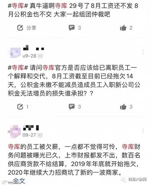 不仅如此,寺库的员工也在各平台反映,从去年年初,寺库便降薪裁员,今年年中更是开始拖欠工资。
