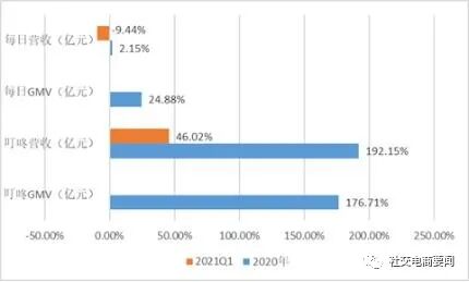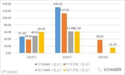 首先,在最基础的经营规模方面,叮咚买菜大约是每日优鲜的2倍。招股书显示,2020年,叮咚买菜的GMV(交易额)和营业收入分别为130.32亿元和113.36亿元,约是每日优鲜(GMV为有效用户GMV)同期数据的两倍。2021年一季度,叮咚买菜实现营业收入38.02亿元,是每日优鲜的2.5倍左右。