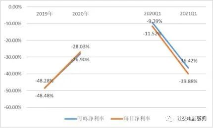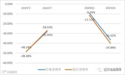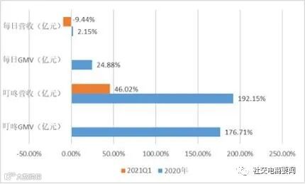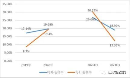 2021年一季度,尽管在疫情催生到家业务激增,2020年同期基数较高的基础上,叮咚买菜营收依然处于高增态势,同比增长46.02%。在同一个赛道,但每日优鲜营收却不升反降,同比降低9.44%,营收规模出现萎缩。总之,从目前的增长速度来看,叮咚买菜和每日优鲜的差距或将持续拉大。