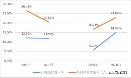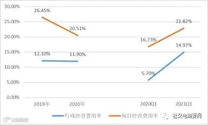 除了受益于规模效应,这还归功于叮咚买菜的精细化运营。以下数据显示,叮咚买菜的经营费用率(包括营销费用、管理费用和研发费用)远低于每日优鲜,其中主要是叮咚买菜的市场投放效率较高,导致营销费用率较低,这有利于叮咚买菜释放出更大的利润空间。