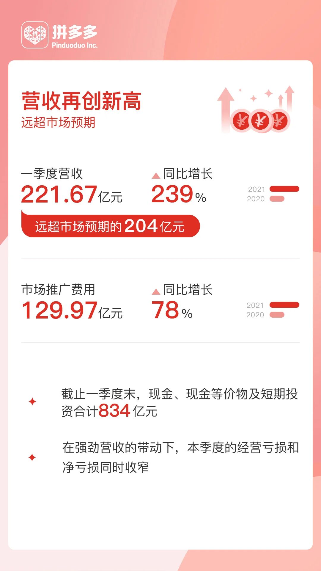 财报显示,拼多多今年一季度营收221.67亿元,去年同期为65.41亿元,同比增长239%,高于市场预期。非通用会计准则下,平台一季度归属于普通股股东的净亏损为18.903亿元,去年同期净亏损为31.696亿元,同比收窄。