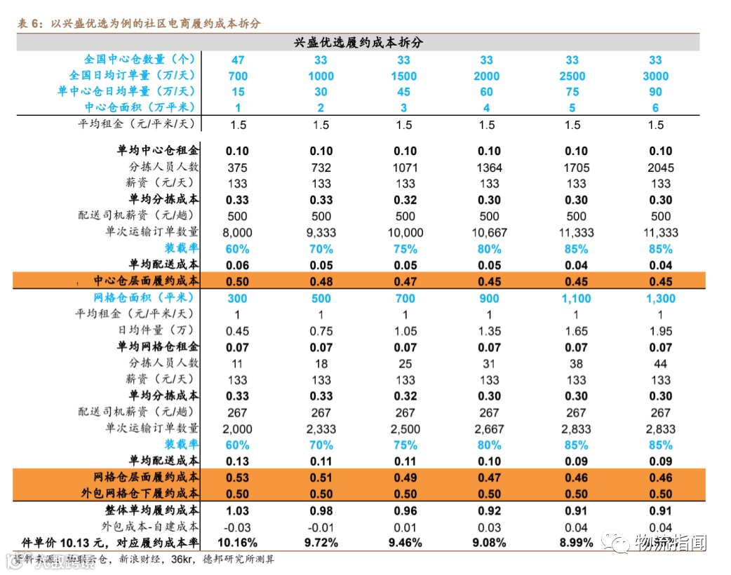 (3)配送成本:根据Hishop统计,兴盛优选专线司机薪资为400-600元/趟,工作时长4-5个小时,配送点2-3个,主要工作职责为装卸货、货物运输。网格仓运输至团长部分参照市场化配送司机薪酬,约8000元/月,对应267元/趟。理想状态下,订单密度较高时运输装载率可以达到85%以上。