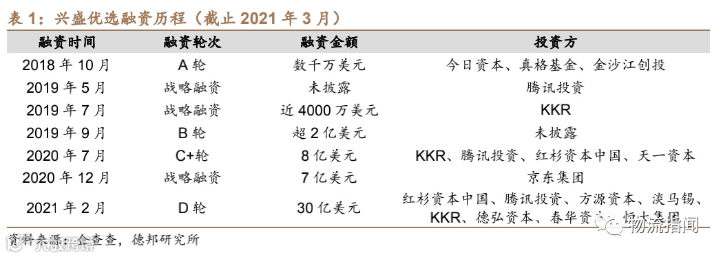 2019年5-7月,兴盛优选分别获腾讯投资、KKR战略投资,其中KKR投资近4000万美元,投后估值10亿美元。2019年9月,兴盛优选获超2亿美元B轮融资。